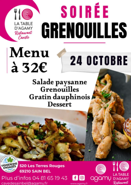 Le vendredi 24 octobre à partir de 19h, La Table d’Agamy vous accueille pour sa Soirée Grenouilles : un moment chaleureux à partager entre amis ou en famille, dans une ambiance authentique et festive.